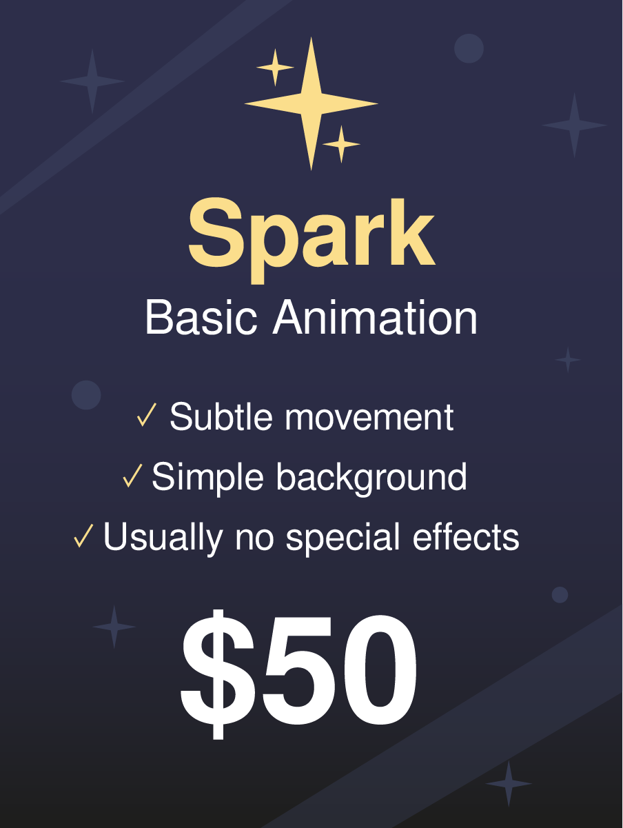 Spark Tier is a basic animation tier. It includes simple character movements and a simple background or no background, without complex special effects.